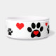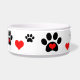 Zeigen Sie Ihrem Hündchen Ihre Liebe mit dieser kundenspezifischen Hundeschüssel! Schwarze Tatzendrucke der Ausrüstungsbeschreibungen und rote Herzen!
