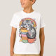 Genießen Sie den Charme der "T - Shirt Pastel Paws & Rainbow Sips", ein reizvolles Design mit einem hübschen, grauen Kätzchen, eingebettet in einen Stapel farbenfroher Tasse, alles Set gegen einen weichen pastellfarbenen Regenbogen. Diese skurrile Abbildung erfasst das Wesen der kawaii Kultur, die beruhigende Pastelltöne mit spielerischen Elementen wie dem Lächeln von Sternen und dem Bummeln von Bienen kombiniert.