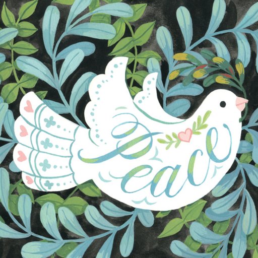 Ein illustrierter Weihnachtsaufkleber zeigt die Gouache-Darstellung einer Taube und Handschrift.