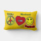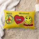 This Peace, Love & Happiness lumbar pillow features playful peace, heart, and smiley icons set on a warm golden yellow background. The green script name detail in the upper-right adds a signature touch while keeping the design balanced and light.