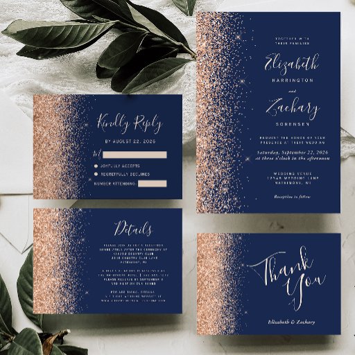 Peach Glitzer Navy Blue Wedding RSVP Karte