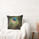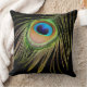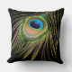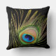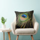 Stilvolles schwarzes Kissen mit farbenfroher Pfauenfeder nah-up.
