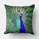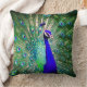 Kopfkissen mit Pfauenbild auf der Vorderseite und Silhouette der Pfauenfeder auf der Rückseite. Hintergrundfarben in tiefblau.