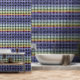 Abnehmbares, gelbes, Lila, blaues Muster geometrisches Tapete mit Peelhalterung. Ein tolles Gaumenprojekt für Mieter Hauseigentümer. Erstellen Sie ein personalisiertes Aussehen für Ihr Zuhause Condo Apartment Schlafzimmer oder Business. Die Wände sind mit Möbeln dekoriert. Erhältlich in texturierter und glatter Vinyl. Größe 2'x4' 2'x8' 2x10' 2'x12' und 2'x1' Uhr.