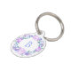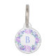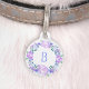 Dieses hübsche I.D.-Anhänger zeigt das Monogramm Ihres Haustieres in Blau, umgeben von einem Blumenkranz aus rosa und lila Peonblüten mit grünem und blauem Blattwerk. Passen Sie die Rückseite mit dem Namen Ihres Tieres und Ihrer Telefonnummer oder anderen Kontaktinformationen in weißem Text auf blauem Hintergrund an.