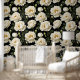 Ein wunderschönes, sich nahtlos wiederholendes Muster von Wand zu Wand cremefarbener Blume mit Senfgold in vollblütigem Set vor einem schwarzen Hintergrund, der kleine grüne Blätter und Torfknospen um die Blüte hat. Diese kühne und elegante Landwiese inspiriert Design hat ein zeitloses und elegantes Sommer / Frühling-Gefühl. Verwandeln Sie jedes Zimmer in ein prächtiges und majestätisches Meisterwerk mit diesem Design, das für jeden großen Raum geeignet ist, sei es als Wohnzimmer, Bad oder Schlafzimmer. Ideal für Landhäuser, englische und französische Cottages, Häuser und Geschäftsumgebungen.