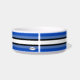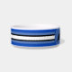 Weiße Keramik Katzenfutterschale mit vier Tonstreifen, Weiß und Schwarz als Grundlage, und jede koordinierende Farbe, die Sie bei der Option "Anpassen" wählen (innerhalb der personalize Option) erscheint in zwei Tönen .HAMbyWhiteGlove. Hier in Blau dargestellt.