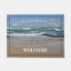 Das personalisierte Beach House Ocean Door Mat zeigt ein ruhiges Foto der blauen und weißen Wellen, des blauen Himmel und des goldenen Sandes der Küste Melbourne, in Australien. Machen Sie Ihr Haus zu einer Zuhause und begrüßen Sie mit dieser beruhigenden Türmatte. Der Text ist in modernem, weißem Schriftart, der so angepasst werden kann, dass Sie Ihren eigenen Familiennamen hinzufügen können.