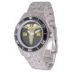 Einzigartiger Caduceus in Elfenbein, Parwinkle, Salbei & Gold in einem von der Arts & Crafts-Bewegung inspirierten Stil wird durch 2 benutzerdefinierte Textfelder für Ihre Initialen um 9:00 & 3:00 ausgeglichen, alles Set gegen ein solides schwarzes Gesicht. Zusammen mit dem eleganten Edelstahlband und der verstellbaren schwarzen Verkleidung ist es perfekt für Ärzte, Krankenschwestern oder andere berufliche Mediziner in Ihrem Leben!