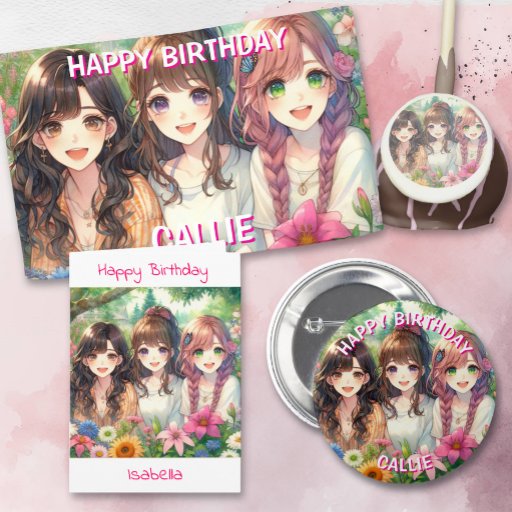 Personalisierter Geburtstagsbanner. Drei niedliche Anime-Mädchen, die im Alter von 10 Jahren oder 10 Jahren alt sind, umgeben von rosa und gelben Blumen.