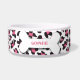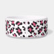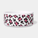 Diese Keramikhundenahrungsmittelschüssel hat ein stilvolles schwarzes, rosa und weißes Cheetahdruckmuster im Hintergrund. In der Mitte gibt es einen großen weißen Knochen mit einem leicht kundengebundenen Namen Ihres Hündchens, das in Rosa geschrieben wird.