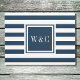 Elegante personalisierte Initialen Monogram Doormat mit einem marineblau-weiß gestreiften Muster mit dem Set Ihrer Initialen in einem marineblau-blauen Quadrat mit einem klassischen weißen Text. Personalisieren Sie Ihre Details und passen Sie die Farbe an die Farbe Ihrer Wahl an. Entwickelt von Thisisnotme©