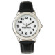 Dieses Bild zeigt eine Kinderuhr mit einem runden, silberfarbenen Gehäuse mit weißem Ziffernblatt. Die Uhr hat große, leicht zu lesende schwarze Zahlen von 1 bis 12, und die Stunden- und Minutenzeiger sind ebenfalls schwarz, mit den Worten "HOUR" und "MINUTE" beschriftet. Der Name auf der Armbanduhr kann auf jeden beliebigen Namen angepasst werden, was ihn zu einem personalisierten Accessoire für Kinder macht.