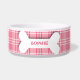 Diese Keramikhundenahrungsmittelschüssel hat ein rosa und weißes kariertes Muster im Hintergrund. In der Mitte gibt es einen großen weißen Knochen mit einem leicht kundengebundenen Namen Ihres Hündchens, das in Pink geschrieben wird.