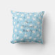Personalisiertes Weihnachtswerfer-Kissen mit niedlichen Eisbären mit abfallenden Schneeflocken auf eisblauem Hintergrund mit Familienname und Jahr in einem klassischen bläugrauen Schriftart. Die Rückseite zeigt Frohe Weihnachten in einem Skript-weißen Schriftart auf einem passenden eisblauen Hintergrund.