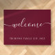Eleganter personalisierter Familienname mit Ihrem Familiennamen mit Ihrem etablierten Datums-Set in einem klassischen, weißen Text auf bordeauxfarbenem Hintergrund mit der Meldung "welcome", das Set in einem eleganten, weißen Schriftzeichen. Personalisieren Sie Ihre Details und passen Sie die Farbe an die Farbe Ihrer Wahl an. Entwickelt von Thisisnotme©
