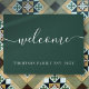 Eleganter personalisierter Familienname mit Ihrem Familiennamen mit Ihrem etablierten Datums-Set in einem klassischen Weiß-Text auf einem smaragdgrünen Hintergrund mit der Meldung "welcome", das Set in einem eleganten, weißen Schriftzeichen. Personalisieren Sie Ihre Details und passen Sie die Farbe an die Farbe Ihrer Wahl an. Entwickelt von Thisisnotme©