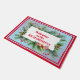 Eine schöne, festliche Türmatte mit botanischen Urlaubskulpturen, roten Beeren, Bonbons und Weihnachtsgeschenken vor dem Hintergrund eines blauen Himmels mit funkelnden Schneeflocken. Ein roter und himmelblauer Rand umrahmt den äußeren Rand. Personalisieren Sie es mit dem Link "Personalisieren Sie diese Vorlage" mit Ihrem Familiennamen. Ihre Feriengäste werden sich so willkommen fühlen, wenn sie diese Matte vor Ihrer Haustür sehen, diese Ferienzeit!