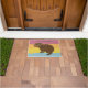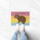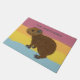 Diese personalisierte Begrüßungsmatte ist ideal für Fans von Capybaras. Es ist bereit, mit Ihrem Namen personalisiert zu sein und bietet eine Abbildung eines Baby Capybara oder Capybara-Jungtier in braun auf einem farbenfrohen gestrippten Hintergrund in Rosa, Orange, Gelb und Hellblau.