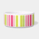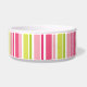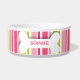 Diese Keramikhundenahrungsmittelschüssel hat ein der Fuchsie, Grünen und weißen Streifenmuster des Rosas, im Hintergrund. In der Mitte gibt es einen großen weißen Knochen mit einem leicht kundengebundenen Namen Ihres Hündchens, das in Pink geschrieben wird.