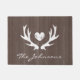 Personalisierte Vintage Land Hirsche Geweihe Türmchen. Rustikales Land schicke Scheune Holz Korntür Matte mit Monogramm, Nachname oder lustigen Zitat. Vintage Brauntöne und Weiß. Holzpaneelhintergrund. Machen Sie Ihre eigene individuelle Innen-/Außenpforte mit individueller Hintergrundfarbe und Sprichwort. Fügen Sie Ihre eigene Willkommensnachricht, Familienname, Monogramm, Nachname oder lustiges Zitat hinzu. Niedliche Geschenkidee für neue Zuhause / Hauswärmung, Hochzeitsort, Geschäft, Shop, Büro etc. Trendy Skripttypografie mit Liebe Symbol und Hörnern. Romantisches Outdoor-Jagdthema. Anpassbare Vorlage. Erstellen Sie Ihre eigene Eintrittsmatte / Teppich für Eingangstür / Eingangshalle oder Eingangshalle. Wohngestaltung / Dekoration für Ihr gemütliches Haus. Niedliches Geschenk für frisch verheiratete Paare, Braut und Bräutigam, Ehemann und Ehefrau.