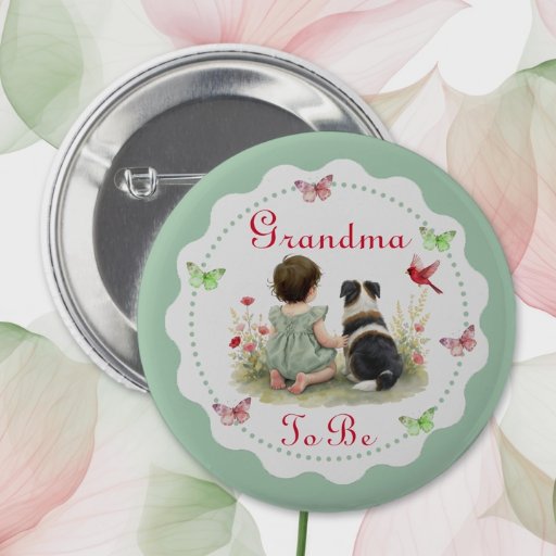 Girl's baby shower personalized Mimi to be button. Sweet baby girl sitting next to her little puppy dog in a patch of pretty watercolor flowers. Sage green and red wildflowers and butterflies background. Get one for each member of the family as a little baby shower favor gift.