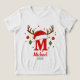 Create a one of a kind holiday keepsake with this festive personalized monogram. This design features the letter 'M' topped with a cute Santa hat and reindeer antlers, ready for your custom text. Click 'Personalize' to easily add a name and the year. Perfect for matching family shirts, custom stocking tags, or a special Christmas gift.