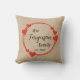 Family name with est. date romantic throw pillow. Beautiful earthy colored pillow decorated with a round red frame with hearts. It celebrates the family with their name printed in a lovely script. Personalize with your surname and wedding year.