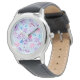 This stainless steel kids watch with a sleek black leather strap features a charming all-over floral pattern designed to inspire joy.