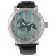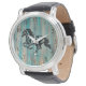 Dies ist eine einzigartige "Eine von einer Art" Pferdewacht! Es verfügt über eine galoppierende schwarze Pferde Silhouette auf einem türkisfarbenen und tan gestressten Holzhintergrund! Original Art Design von Künstler Kerry Miller!