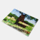 Eine Malerei eines freundlichen Pferds, das scheint, Sie über dem Zaun und dem Sprichwort "Willkommen" zu grüßen.