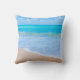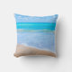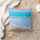 Ein quadratisches Kissen mit einem Foto einer klaren, blauen Ozeanszene mit sanften Wellen an einer Küste und weichem braunem Sand. Ein blauer Himmel mit flauschigen Wolken in der Ferne. Serene tropische idyllische Jahreszeit.