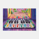 Eine farbenfrohe Türmatte, die an eine Klaviertastatur erinnert, mit Fußabdrücken auf den Tasten. Die Türe führt zu einer offenen Tür, die ein Stadtbild mit einem mit Kopfsteinpflaster gesäumten Weg offenbart. Herzlich willkommen bei Ihren Lieben mit diesem - Erstaunliche, farbenfrohe Klaviertasten, die für Ihre Füße entworfen wurden, bevor Sie die Tür betreten.