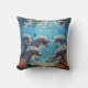 The pillow depicts a group of dolphins swimming among colorful corals in soft blue water.