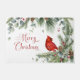 Schönes Weihnachtsgrün mit Kiefernästen und Kiefernhäuten und lebhaftem rotem Kardinal. Mit den Worten Frohe Weihnachten - es gibt auch eine Version mit Happy Holidays.