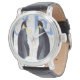 Das Design dieser Vintagen Lederrippe eWatchFactory Watch besteht aus zwei Kaiserpinguinen, die sich mit Bleistiften in Aquarellfarben illustriert gegenüberstehen. Im Hintergrund sind kleine, gelbe Liebe Herzen gemalt hinter zwei großen blauen Liebe Herzen zentriert hinter den Pinguinen.