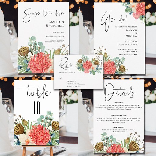 Diese wunderschöne Hochzeitssuite ist mit einem Blumenstrauß in Aquarellfarben in Rosa, Elfenbein, Grün und Blau gestaltet. Botanische Elemente Palmen, Samentöpfe, getrocknete Schilf, Blume, Eukalyptus und Grünpflanzen. Die Suite ist perfekt für eine Hochzeit mit einem Blumenstrauß, hellen Farben und einem schlichten, modernen Design geeignet.