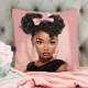 Dieses Kissen fängt ein schicke Porträt einer schwarzen Frau mit einem stilvollen, von einem rosa Bogen hervorgehobenen updo ein und macht es zu einer perfekten Mischung aus Charme und Eleganz für jedes Interieur.