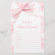 Elegantes und raffiniertes "Baby word cramble" Spiel, entworfen für eine Babydusche mit Coquette-Thema. Mit einem hübschen, von der Hand gezeichnet Bogen auf dem Bohemianbogen und einem Vintagen, rosa Blumenmuster am Ende verleiht dieses klassische Spiel Ihrem Event eine Touch zeitlosen Stils und Spaß. Ideal für die Unterhaltung der Gäste und für die Gestaltung von Erinnerungen, ist es eine ideale Ergänzung zu einer süßen und hübschen Babydusche. Antworten: 1. Windeln 2. Rattle 3. Schnuller 4. Formel 5. Schwangerschaft 7. Rolle 8. Kindersitz 9. Flasche 10. Kinderzimmer