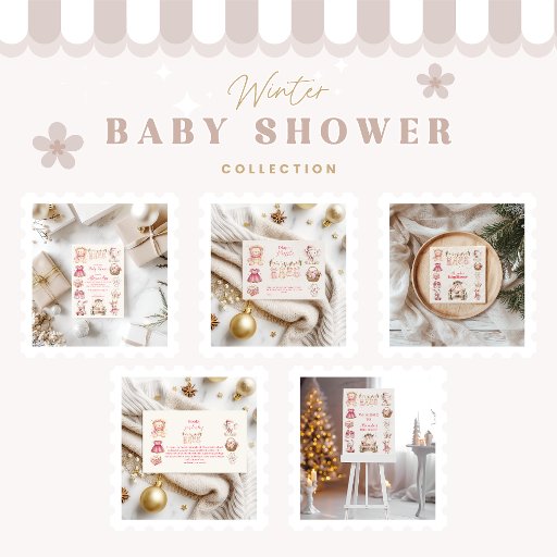 Dieses festliche Baby-Duschdesign strahlt mit Urlaubsfreuden aus und besticht durch eine Collage von handbemalten rosa Elementen - von kuscheligen Wintertieren über gemütliche Outfits bis hin zu Kuchen, Spielzeug und einer traumhaften Krippenlandschaft. Weiche Farbtöne und Aquarellfarben sorgen für ein spielerisches und herzliches Fest, um ein kleines Mädchen während der magischen Weihnachtszeit willkommen zu heißen.