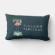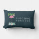 Kissen mit einer Illustration eines rosa Flamingo mit grünen Palmen hinter und stehend auf einem Bett von blumengeschmückten Blume. Tropisch und hübsch. Der Hintergrund ist dunkelblau. Text sagt Flocking Fabulous.