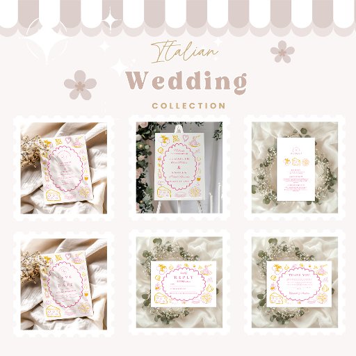 Mit diesem gelb gestreiften Hochzeitsdesign verleihen Sie Ihrem Fest italienischen Charme. Mit spielerischen handgezeichneten Illustrationen von Pasta, Wein, Tomaten und einer gemütlichen Zuhause ist dieses skurrile gastronomische Design perfekt für moderne Paare, die eine kühne Persönlichkeit und mediterrane Liebe haben. Ideal für Hochzeiten im Sommer, Weinberge und Empfang in Italien.