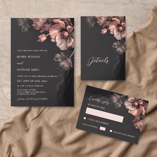 This elegant Wedding Response Card features pink metallic flowers on a black background. Matching invitation available.
