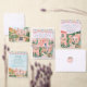 This destination wedding details enclosure card features painted artwork of papel picado on the top edge. On the back is a Mexican church surrounded by tropical flowers. All the important wedding details can be personalized. Colors include green, pink, white and coral.