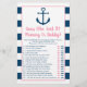 Diese niedlichen Ratgeber, die gesagt haben, es Mama oder Daddy Spielkarten sind eine lustige Baby Shower Aktivität. Sie können sie einfach während der Baby-Dusche weitergeben, wo die Gäste Spaß dabei haben, zu erraten, wer gesagt hat - Mommy oder Daddy. Dieses bezaubernde nautische Design zeichnet sich durch einen niedlichen Anker mit Herzverzierung aus.