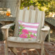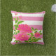 Dekorieren Sie Ihre Gartenmöbel mit bunten rosa Kissen. Dieses quadratische Kissen mit einem rosa und weiß gestreiften Hintergrund mit einem Overlay aus rosa Blume mit grünen Blätter. Eine fröhliche Blume, die sich gut mit den Farben Grün, Weiß oder Rosa abstimmt. Die Rückseite des Kissens ist massiv rosa. Wenn Sie lieber dieses Kissen innen verwenden, dann wählen Sie ein anderes Gewebe.