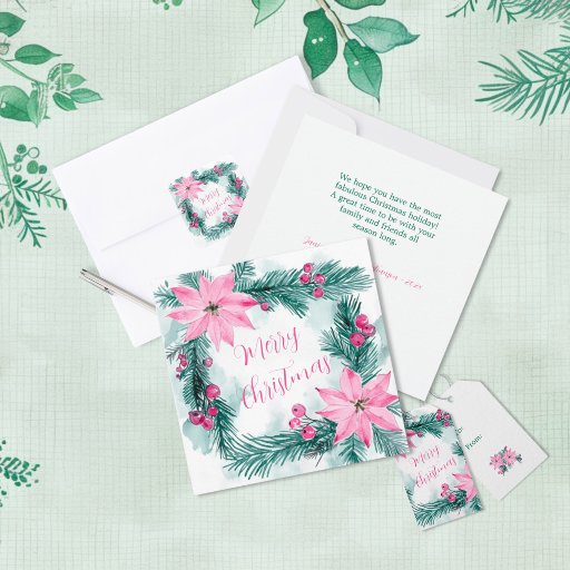 Poinsettias zeigen Weihnachten kommt! In den hübschen Blume und Beeren in dieser Vintagen Aquarellfarbe gibt es hübsche Pinke. Das grüne und aquamarin-grüne Blattwerk bildet einen schönen Kranz in diesem botanischen Bild, der die Buchstaben, Geschenke und Pakete, die Sie gewollt, um Ihre Freunde und Verwandten für die Winterferien zu senden, verbessern wird. Der Text kann bearbeitet werden: Wenn Sie einen anderen Gruß bevorzugen, mit Ausnahme der "Frohe Weihnachten", die wir hier haben, können Sie das ersetzen.