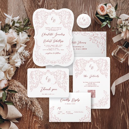 Eleganter skizzierter, Vintager geblüht Rahmen mit Monogramm und stilvollem Skript-Schriftart in staubigen Rosa und Bordeaux, modern und elegant, großartige personalisierte Schreibwaren für moderne Hochzeit, luxuriöse Vintage Hochzeit und romantische formelle Hochzeit.