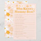 Mit unserem Personalisierten Pink Spring Baby Shower Game "Who Knows Mommy Best" können Sie Ihre Babydusche ganz besonders genießen. Dieses hübsche Spiel ist perfekt für Babydusche geeignet und passt zu verschiedenen Themen der Frühjahrsdusche. Ob Sie die Ideen der Frühjahrs-Babydusche erkunden, eine Babydusche im April beherbergen oder nach März-Babydusche suchen, das Blumendesign ergänzt die Themen der Gartenbabydusche und die Themen der Wildblume-Babydusche. Ideal für eine Babydusche mit blühender Dusche, sie verleiht jedem Baby eine Touch Eleganz in Blütendusche oder in Blütendusche.