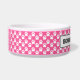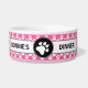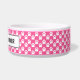Diese Schüssel hat einen weißen Hundepflaster in einem schwarzen Kreis in der Mitte. Um ihn herum gibt es zwei anpassbare Textbereiche, die nun "Abendessen" und den Namen des Tieres lesen. Der Hintergrund hat ein Muster weißer Hundepads in rosa Farbe. Die rosa Farbe kann bei der Anpassung in jede andere Farbe geändert werden.